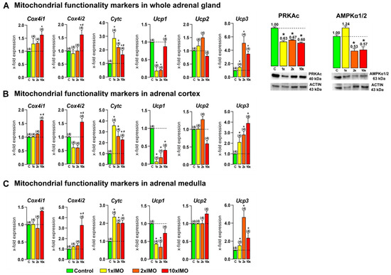 Furthermore, psychophysical stress by immobilization changed the expression of Ucp1 in the analyzed adrenal gland tissues. The acute (1 × IMO) and 2 × IMO treatments decreased the transcription of Ucp1 in the whole adrenal gland (1 × IMO 5.4-fold, 2 × IMO 4.9-fold), adrenal cortex (1 × IMO 14.2-fold, 2 × IMO 5.3-fold), and adrenal medulla (1 × IMO 2.3-fold, 2 × IMO 2.9-fold). Additionally, the 10 × IMO treatment decreased the transcription of Ucp1 in the adrenal cortex (2.6-fold) compared with that of the control group, while the 10 × IMO treatment increased the transcription of Ucp1 in the whole adrenal gland (4.7-fold) compared to that of the 1 × IMO group. In contrast, both the acute (1 × IMO) and repeated (2 × IMO and 10 × IMO) stress treatments significantly increased the transcription of Ucp3 in the whole adrenal gland (1 × IMO 1.5-fold, 2 × IMO 5.1-fold, 10 × IMO 3.5-fold), adrenal cortex (1 × IMO 2.1-fold, 2 × IMO 2.8-fold, 10 × IMO 3.9-fold), and adrenal medulla (1 × IMO 1.5-fold, 2 × IMO 4.7-fold, 10 × IMO 2.4-fold) (Figure 5). Furthermore, an analysis of the protein expression of kinases important for mitochondrial functionality, PRKAc (Protein kinase C, catalytic subunit) and AMPKα1/2 (5′-AMP-activated protein kinase, α subunit), showed that both types of repeated stress (the 2 × IMO and 10 × IMO treatments) decreased the protein expression of mentioned kinases, but only the 1 × IMO stress treatment decreased the expression of PRKAc in the whole adrenal gland.