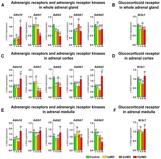 Acute and repeated psychophysical stress of the entire organism changed transcriptional profiles of adrenergic receptors and adrenergic receptor kinases but not glucocorticoid receptor in the whole adrenal gland, adrenal cortex, and medulla tissues. Whole adrenal gland (A,B) tissue as well as adrenal cortex (C,D) and medulla (E,F) tissues were isolated from undisturbed rats, as well as acutely (1 × IMO) and repeatedly (2 × IMO and 10 × IMO) stressed rats. Tissue was further used for RNA isolation followed by an analysis of the transcriptional profile of adrenergic receptors, adrenergic receptor kinases, and glucocorticoid receptor. The data bars represent mean ± SEM values of two independent, in vivo experiments (number in brackets above the bars represents number of analyzed animals). Statistical significance was set at level of p < 0.05: * vs. control group and # vs. 1 × IMO group.