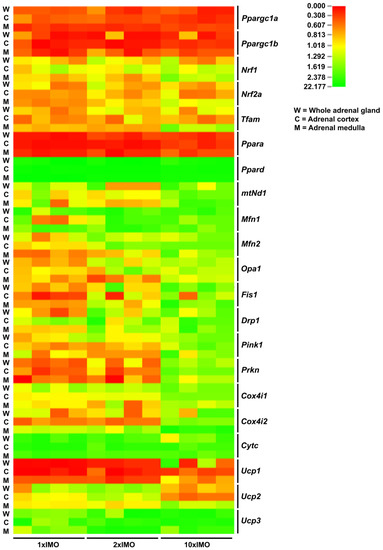 Heat map analysis of the transcriptional profile of the mitochondrial dynamics and functionality markers in whole adrenal gland (W) tissue as well as the adrenal cortex (C) and medulla (M) tissues isolated from undisturbed rats, as well as acutely (1 × IMO) and repeatedly (2 × IMO and 10 × IMO) stressed rats. The color gradient from red to green represents low to high expression levels, respectively.