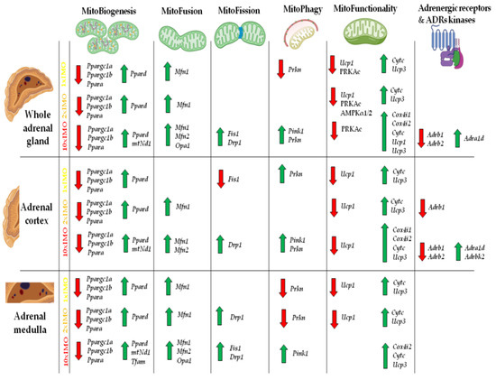 The transcriptional profile of mitochondrial dynamics and functionality markers, adrenergic receptors, and adrenergic receptor kinases in whole adrenal gland tissue as well as adrenal cortex and medulla isolated from undisturbed rats, as well as acutely (1 × IMO) and repeatedly (2 × IMO and 10 × IMO) stressed rats. The green up arrow symbol represents increased transcription, while the red down arrow symbol represents decreased transcription.