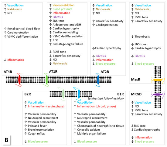 The connection of the kallikrein–kinin system (KKS) and the renin–angiotensin system (RAS) with respect to intervention by SARS-CoV-2. (A) Bioactive peptides, their receptors and (B) their functions. For involved proteins, see Supplementary Figure S1. The KKS and RAS are connected by the action of the angiotensin-converting enzyme (ACE), which deactivates bradykinin (BK) and cleaves angiotensin (Ang) I to Ang II. Vasoactive BK is formed from kininogen by the action of kallikrein. The latter needs the Hageman factor to be cleaved from its precursor, and it also influences the RAS by catalyzing the cleavage of prorenin to renin, which, in turn, assists the formation of Ang I from angiotensinogen. The generation of Ang II ensures blood pressure homeostasis and is counter-balanced by ACE2, which cleaves Ang II. Carboxypeptidase N (CPN) degrades BK to des-Arg9-BK, which can be deactivated by ACE2. In the classical RAS, Ang II binds to its receptors AT1R and AT2R with opposite effects on, among other functions, blood pressure and inflammation. The main antagonist to the classical RAS is ACE2, which removes Ang II by cleavage to Ang (1–7); this peptide binds to the Mas receptor (MasR), thereby reducing blood pressure. BK acts via receptors B1 and B2. CPN cleaves BK and thus changes receptor specificity from B2R to B1R [7,8,9]. ACE inactivates BK, and ACE2 cleaves des-Arg9-BK. More processes involving several other enzymes such as neutral endopeptidase/neprylisin (NEP) have been described in addition to the main pathways. Positions where inhibitors (ACEIs/ARBs) act are marked. The figures were assembled based on information collected in refs. [5,6] and reviews [2,3,10,11,12]. AD—aspartate decarboxylase, APA—aminopeptidase A, APN—alanyl aminopeptidase N, CPA—carboxypeptidase A, MRGD—Mas-related G protein-coupled receptor member D, NO—nitric oxide, PEP—prolyl endopeptidase, PSNS—parasympathetic nervous system, ROS—reactive oxygen species, SNS—sympathetic nervous system, THOP1—thiocyanate oligopeptidase, VSMC—vascular smooth muscle cells.
