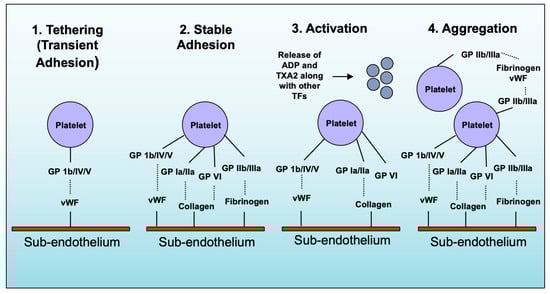 The hemostatic cascade signaling pathway starts with platelet receptors and some ligand interactions expressed on the surface of endothelial cells, in the subendothelial matrix, and as soluble proteins in the bloodstream [,,]. This interaction triggers platelet adhesion and activation, developing thrombi [,,]. GPIb/IV/V, GPVI, and GPIa/IIa receptors are particularly physiologically relevant to platelet adhesion [,]. The first step is tathering, the platelet interaction with the exposed endothelial cell matrix (ECM) [,]. Especially when blood flows through small arteries and arterioles at high rates, platelets first attach to the ECM by binding platelet GP1b and vWF [,]. However, the binding between vWF and GP1b has a quick off-rate and is consequently not enough to mediate firm adhesion [,]. Instead, it maintains a close connection between the platelet and the surface, facilitating the interaction between GPVI and collagen [,]. The next step is the rolling step. Due to the relatively low-affinity interactions between collagen and GPVI, the platelet GPIa/IIa receptor enhances the platelet interaction with collagen [,]. Following stable platelet adhesion, the next step is platelet activation, a paracrine- and autocrine-mediated signaling pathway [,]. The process begins with the discharge of thromboxane A2 (TXA2) and adenosine diphosphate (ADP) from platelets, along with the activation of thrombin by tissue factor present in the artery wall [,]. This integrates the integrins GPIIb/IIIa with fibrinogen and vWF, reinforcing the firm attachment of platelets and resulting in stable thrombus formation [,]. The action of thrombin causes fibrinogen to be changed into fibrin, promoting the growth of the thrombus [,]. The summary of platelet adhesion, activation, and aggregation is illustrated in Figure 1.
