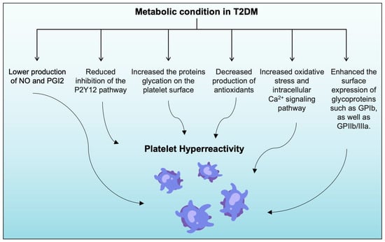 Thus, platelets become more responsive to thrombin and aggregate more, increasing platelet adhesion and sensitivity [,]. Some evidence also indicates that metabolic changes in patients with T2DM increase the surface expression of specific glycoproteins: GPIIb/IIIa and GPIb [,,]. This increase in expression can lead to greater activation of GPIIb/IIIa, thereby increasing the binding of platelets to vWF and fibrinogen, ultimately leading to greater platelet aggregation. [,,]. The summary of metabolic conditions in T2DM-induced platelet hyperreactivity is presented in Figure 2.
