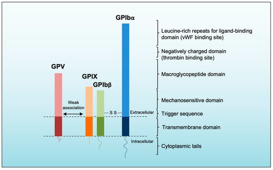 Platelet GPIb/IX/V’s structure has been well-reviewed elsewhere [,]. Briefly, GPIb/IX/V is a protein complex comprising three components: GPIbα-GPIbβ, GPIX, and GPV (Figure 3) []. The GPIbα, GPIbβ, and GPIX cluster into the GPIb/IX complex on the platelet membrane [,]. GPIbα is the largest one and mediates interactions with many known ligands []. It contains eight LRR that form the ligand-binding domain (LBD) and a negatively charged portion with three tyrosine residues with sulfate groups crucial for thrombin binding [,,]. Additionally, GPIbα has a mucin-like macroglycopeptide region that aids in ligand-receptor complex formation []. The mechanosensitive domain (MSD), another identified domain in GPIbα, is located next to the macroglycopeptide region and can be cleaved by ADAM17, releasing soluble GPIbα fragments into the plasma [,]. Recently, a trigger sequence of 10 amino acid residues has been discovered near the transmembrane domain of GPIbα []. The discovery provides support for the GPIb-IX signaling model, proposing that when external forces act on the LBD of GPIbα, it induces the unfolding of the mechanosensitive domain (MSD) []. This unfolding exposes a trigger sequence, resulting in receptor activation and the subsequent initiation of signaling pathways within the platelet []. The other components of GPIbα-GPIbβ, the GPIbβ, make disulfide bonds with GPIbα and are connected to GPIX []. GPIbβ engages in intracellular interaction with calmodulin, whereas GPIX does not form associations with any intracellular molecules [,]. Moreover, the cytoplasmic tail of GPIbα possesses multiple binding sites for intracellular signaling molecules, facilitating the connection of the receptor complex to actin filaments within the cytoskeleton []. Interactions between the transmembrane domains of the components, including the engagement of GPIbβ and GPIX with the mechanosensitive domain (MSD) of GPIbα, stabilize the GPIb-IX complex []. The association of GPV with the complex is relatively weak, and its susceptibility to non-ionic detergents suggests that the GPIb/IX complex can potentially interact with other membrane receptors along with GPV [].