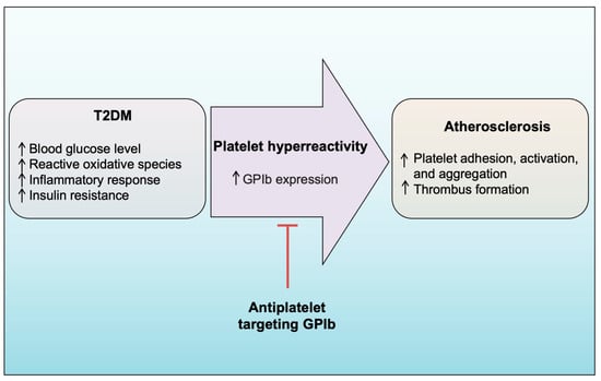 Platelet glycoprotein-Ib (GPIb) may act as a bridge between T2DM and atherosclerosis. In the context of T2DM, various risk factors such as high glucose levels, insulin resistance, oxidative stress, and inflammation can contribute to increased platelet hyperreactivity. One of the effects of these risk factors is the upregulation of GPIb expression, which promotes platelet adhesion, activation, and aggregation. These processes, in turn, contribute to the development and progression of atherosclerosis.