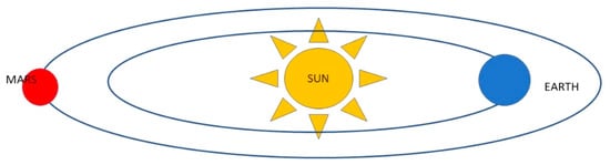 An inevitable blackout shall occur during the “solar conjunction” (Figure 1) when the spacecraft will not be able to communicate with Earth for about two weeks every two years [81]. This peculiar phenomenon is due to the obscuring caused by the Sun passing between the Earth and Mars, whereby the Earth and Mars cannot “see” each other as the Sun is on the trajectory between the two planets [80]. No attempt can be made to send new instructions to Mars during solar conjunction, as it is impossible to predict the effects of interference from charged particles from the Sun on data transmission which could cause loss of important information. This challenge must be taken into account not only when travelling to Mars but even more so when settling on the planet’s surface [80,81,82].