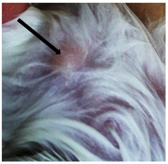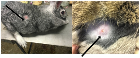 In infected rabbits, on day 4, a formation of skin nodules with a diameter of 1.0–1.5 cm was noted at the site of inoculation (Figure 2). Nodules on the skin persisted for 4–6 days.