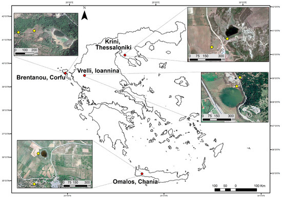 Map of Greece with the location of four temporary ponds shown (red dots). Inset: aerial photos at each pond with the two recording sites shown (yellow dots; one near the water edge when wet and one far from the edge ca. 300 m from the edge of the pond when wet).