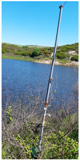 Acoustic sampling started 30 min prior to sunset and continued through the night until sunrise using SM4BAT-FS (Wildlife Acoustics, Maynard, MA, USA) bat recorders with the following settings: gain: 12 dB, 16 k high filter: on, sample rate: 256 kHz, min duration: 3 ms, max duration: none, min trig freq: 16 kHz, trigger level: 12 dB, trigger window: 3 s, max length: 00 m:15 s. We used SMM-U2 microphones (Wildlife Acoustics) connected to recorders attached to the top of 3 m poles (Figure 2) at least 1 m away from vegetation and buildings. The microphone was always facing toward the sky and the back of the microphone was opposite the lake to optimize its cardioid sensitivity pattern. Bats usually stop hunting when it rains [30,31] and therefore we avoided, as much as possible, recording when there was rain or/and strong wind.
