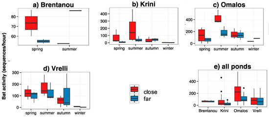 Total bat activity (sequences/hour) at the sites close and far from water, (a–d): per temporary pond and per season and (e): per pond, for all seasons together. The recordings were conducted monthly, during three consecutive, full nights monthly over three months (March, April and beginning of June 2019) at Brentanou, over twelve consecutive months (March 2019–February 2020) at Vrelli, thirteen consecutive months (June 2019–June 2020) at Krini and eleven consecutive months (March 2019–April 2020) at Omalos. Close: at the water’s edge, far:150–300 m from the shore.