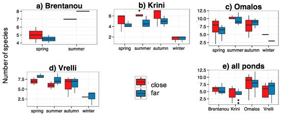 Total number of species at each site (close vs. far from water), (a–d): per temporary pond and per season and (e): per pond, all seasons together. Note: only confidently identified species were calculated, the actual number of the species is expected to be higher. Recordings during three consecutive, full nights, monthly over three months (March, April and the beginning of June 2019) at Brentanou, over twelve months (March 2019–February 2020) at Vrelli, thirteen months (June 2019–June 2020) at Krini and eleven months (March 2019–April 2020) at Omalos. Close: at the water’s edge, far: 150–300 m from the shore.