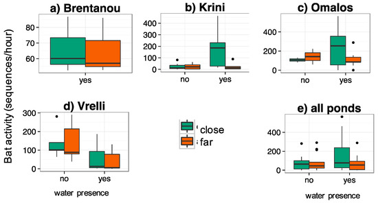 Total bat activity (sequences/hour) at each site (close vs. far from the water), per pond and for all ponds together, for the period when there was water presence or not. Recordings during three consecutive, full nights, monthly over twelve months (March 2019–February 2020) at Vrelli, thirteen months (June 2019–June 2020) at Krini and eleven months (March 2019–April 2020) at Omalos. Close: at the water’s edge, far: 150–300 m from the shore.