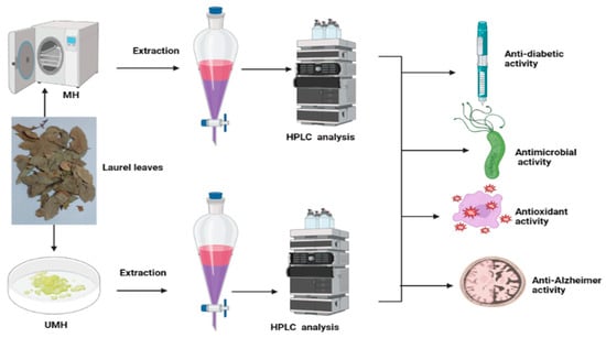 Helicobacter pylori is one of the most common chronic bacterial pathogens of human beings at all age stages. Numerous illnesses of the upper gastrointestinal tract, such as gastric inflammation and gastric and duodenal ulcers, have been associated with H pylori [14,15]. Gastritis development and peptic ulceration are caused by ammonia release from H. pylori urease that acts as virulence and colonization factors. However, while the antimicrobial activity of L. nobilis leaf extract has been studied extensively on several microorganisms, there is limited research on H. pylori. As mentioned previously, H. pylori was inhibited by L. nobilis leaf extract with an inhibition zone of 24 mm at 200 mg/mL [16]. Secondary metabolites of the plant have been recommended as possible alternatives for the treatment of H. pylori as well as other microbes [17,18,19,20,21,22]. Alzheimer’s disease (AD) is a chronic neurodegenerative disease that is considered one of the most common health issues in the world, and its prevalence is increasing among the elderly population [23]. Investigators have continued to develop and discover bioactive substances of a natural origin in the creation of novel drugs for efficient treatment as a result of the continuous rise in the incidence of neurological disorders in humanity. AD is associated with acetylcholine depletion in the brain, which is due to acetylcholinesterase (AChE) and butyrylcholinesterase (BChE) catalytic activities [24], thereby making AChE and BChE potential targets for drug design in the management of AD. Most published reports have explained the biological activities of different fresh or dried organs of L. nobilis extract, but without considering the effect of moist heat on plant constituents. There is scarce information about the impact of moist heat on the biological activities of L. nobilis extract. Therefore, in this investigation, we present the effects of moist heat on the chemical constituents of L.nobilis, and its anti-H. pylori, antioxidant, antidiabetic, and anti-Alzheimer’s activities
