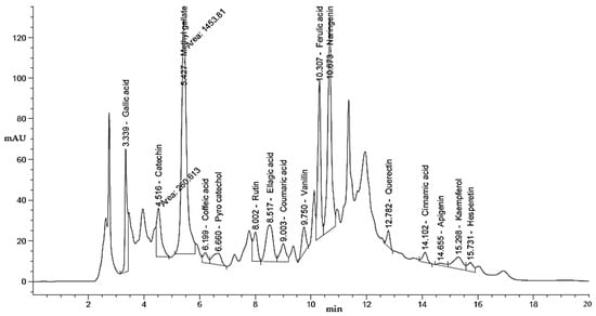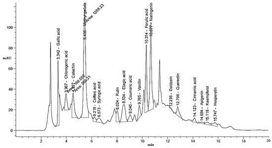 HPLC chromatogram of identified phenolic and flavonoid constituents in moist-heated laurel leaf extract.