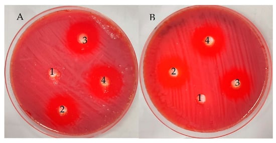 Antimicrobial activity of UMH (A) and MH (B) laurel leaf extracts (1, negative control; 2, positive control; 3 and 4, two wells of the plant extract).