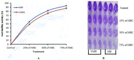 The UMH LLE exhibited anti-H. pylori activity but less than the MH LLE, with inhibition zones of 23.67 ± 0.58 mm and 26.00 ± 0.0 mm, respectively (Table 2 and Figure 4). The inhibitory potential of both UMH and MH LLEs was good compared to the positive control that showed an inhibition zone of 20.33 ± 0.58 mm against H. pylori. Our results were consistent with previous findings [16], where acetone and hexane extracts of L. nobilis inhibited H. pylori with inhibition zones of 24 mm and 26 mm, respectively. Dobroslavić et al. [41] demonstrated the antimicrobial activity of LLE. The presence of numerous flavonoid and phenolic compounds in the LLE is one of the main reasons for the anti-H. pylori activity. For instance, ellagic acid [42], naringenin [43], and ferulic acid [15] exhibited anti-H. pylori activity. Several investigations have shown that flavonoids play a critical role in inhibiting the spread of H. pylori [15,44,45]. The MH LLE showed greater inhibitory activity than the MH LLE, which might be related to the fact that the most analyzed compounds via HPLC were detected at the highest concentration compared to the fresh extract. It is very clear that the MIC and MBC values of the MH LLE were significantly (p < 0.05) lower (1.9 µg/mL) than the MIC and MBC values of 7.8 µg/mL of the UMH LLE (Table 2). Via the calculation of the MBC/MIC index, it is obvious that both UMH and MH LLEs possess cidal activity due to the MBC/MIC index being one (Table 2). The biofilm formation of H. pylori was more affected by the MH LLE than the UMH LLE. The anti-biofilm activity increment with an increase in MBC concentrations of the MH and UMH LLEs. In the same line, it was observed that the anti-biofilm activity of the MH LLE was higher than the UMH LLE; for instance, the anti-biofilm activity was 93.73 and 87.75% at 75% for the MH LLE’s MBC and the UMH LLE’s MBC, respectively (Figure 5A). The anti-biofilm activity of the MH and UMH LLEs was also indicated by the change in the color of stained H. pylori biofilm in the microtiter plate, which was dependent on anti-biofilm activity (Figure 6B).