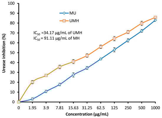 The concentration that stimulates an inhibition value halfway between the minimum and maximum responses of the extract (IC50) was detected by checking the inhibition influence of different concentrations of the extract in the test. Urease inhibition was recorded using hydroxyurea as the standard compound [29].