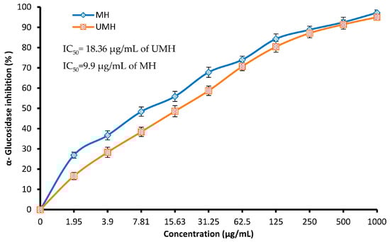 α-glucosidase activity inhibition is considered a successful strategy for controlling the level of blood sugar and regulating food-related hyperglycemia. In our investigation, both the MH and UMH LLEs were effective inhibitors of glucosidase in a dose-dependent manner (Figure 7). However, the MH LLE showed the highest inhibitory activity toward this enzyme compared to the UMH LLE, particularly at low concentrations of up to 31.25 µg/mL; for instance, at 1.95, 7.81, and 31.25 µg/mL using the MH LLE, glucosidase inhibition was 26.9, 48.4, and 55.9%, while using the UMH LLE, α-glucosidase inhibition was 16.6, 38.4, and 58.7%, respectively. The values of IC50 of the two extracts were promising, but from the present findings, the IC50 of the MH LLE was significantly (p < 0.05) more promising (9.9 µg/mL) compared to the IC50 of the UMH LLE (18.36 µg/mL). These results may be because of the presence of some compounds in the UMH LLE. According to a study performed by Khan et al. [49], the lipid and glucose profiles of diabetic patients were improved because of treatment with powdered L. nobilis leaves in capsule form. In another study, L. nobilis (bay laurel) extracted with different solvents inhibited α-glucosidase metabolic activity [50]. Our finding endorses the utilization of LLE, particularly MH, for further investigations to identify their potential for regulating type II diabetes. Earlier investigations have shown that several natural plants contain rich constituents with valuable inhibitory potential toward α-glucosidase. According to a previous study [51], quercetin and rutin could inhibit glucosidase via binding with alpha-glucosidase to form a new complex. A recent report showed that catechin and quercetin displayed significant inhibitory potential toward α-glucosidase with different IC50 values of 12.78 and 92.87 μg/mL, respectively, while some compounds such as gallic acid and ellagic acid displayed moderate α-glucosidase inhibitory capacity, with IC50 values of 102.35 and 222.80 μg/mL, respectively [52].