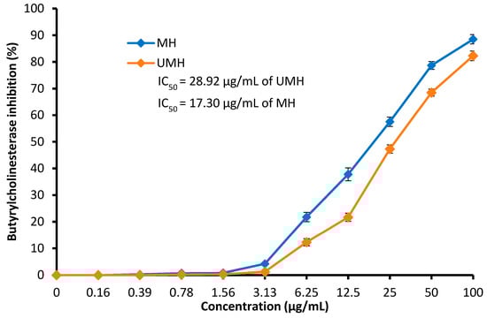 In the current study, inhibition of butyrylcholinesterase (BChE) was recorded as a result of exposure to the LLEs (Figure 8). This enzyme is used as a marker of Alzheimer’s disease (AD) development. Recently, Falade et al. [53] reported that L. nobilis may be considered a promising agent for the nutraceutical management of AD. Figure 8 shows that the inhibition of BChE activity increases with an increase in both the UMH and MH LLEs up to 100 µg/mL, with inhibition of 82.3 and 88.5%, respectively. The MH LLE has the best inhibitory potential for BChE, with an IC50 of 17.3 µg/mL, compared to the UMH LLE, with an IC50 of 28.92 µg/mL, at all concentrations used; these results may be related to the high concentrations of the most detected compounds in the MH LLE as recorded in the HPLC analysis. Inhibition of two enzymes, namely BChE and acetylcholinesterase (AChE), was observed (100% inhibition) as a result of exposure to 30 µg/mL of L. nobilis extract, with IC50 values of 4.76 ± 0.36 µg/mL and 4.21 ± 0.50 μg/mL, respectively [53]. In vivo, phytoconstituents of L. nobilis had inhibitory action against BChE and AChE in scopolamine-induced rats [54].