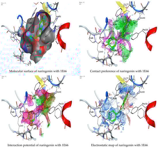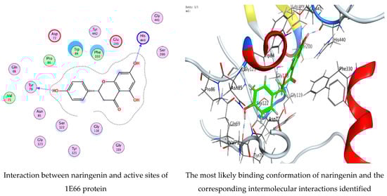 The crystal structures of acetylcholinesterase (PDB code 1E66) and butyrylcholinesterase (PDB code 6EMI) proteins were downloaded from the protein data bank (https://www.rcsb.org/, accessed on 30 March 2021). Naringenin was docked via the MOE 2019 software. Both receptor and compound creation and optimization were carried out using the software’s default method for structural optimization. Hydrogen atoms were added after the elimination of all water molecules around the proteins. Then, naringenin optimized its shape with the lowest binding energy while using the MMFF94x force field to achieve this optimization. Alpha-site spheres were created using the site finder in the MOE module. The five best binding configurations with flexible molecular rotation were created using the DFT-optimized structure of naringenin. The free binding energy (S, in kcal/mol), which represents the binding affinity, was ranked using hydrogen bonds that developed between the proteins and naringenin. Validation was performed by re-docking naringenin into the binding pocket and measuring the root-mean-square deviation (RMSD) between positions.