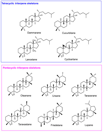 Structures of the main tetracyclic and pentacyclic triterpene skeletons.