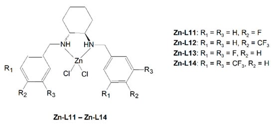 Several complexes of reduced Schiff bases from substituted benzaldehydes and 1,2-diaminocyclohexane have been synthesized and their X-ray crystal structures described in the literature. They have the general structure [Zn(L)Cl2]. The structure of an analogous complex with chiral N,N′-dibenzyl-(R,R)-1,2-diaminocyclohexane has been reported [30]. The complex is chiral due to the presence of an enantiomerically pure ligand. Similar to the complexes prepared by us, the coordination in the zinc complex is distorted tetrahedral. A related structure shows the Zn(II) complex with the reduced Schiff base N,N′-bis(4-methoxy-benzyl)-cyclohexane-1,2-diamine [31]. Dichloro zinc complexes with N,N′-bis-(2,6-dichloro-benzyl)-(R,R)-1,2-diaminocyclohexane and with N,N′-bis(2-fluorobenzyl)-(R,R)-1,2-diaminocyclohexane have also been described, both exhibiting nearly tetrahedral geometry [32,33]. Reduced Schiff base Zn(II) complexes of cyclohexane-1,2-diamine containing naphthalene moieties were synthesized [34]. Along with the normal bis-Schiff base complexes, a zinc complex with an unsymmetrical Schiff base (only one amino group substituted) was also prepared.