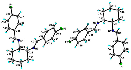 Diffraction measurements for the compounds L1, L2, and L4 were carried out with the help of a Stoe STADIVARI diffractometer. Dectris Pilatus 300 K detector together with a Genix3D Cu HF source were used (λ = 1.54186 Å, Cu-Kα). The temperature was kept at 100 K during the experiment employing a Cobra Oxford Cryosystems cooler with a nitrogen gas open flow. Stoe X-Area detector software was applied for data reduction [35]. The refinement for all non-hydrogen atoms was done with anisotropic thermal parameters. Optimization of positions of all H atoms was carried out under the constrain of riding on their parent atoms, with C–H (aromatic and imino group) bond length of 0.95 Å (for all compounds L1, L2, and L4), C–H(aliphatic) bond length of 0.99 Å, and C–H(aliphatic asymetric) bond length of 1.00 Å. Hydrogen’s temperature factors Uiso(H) = 1.2 Ueq(C).