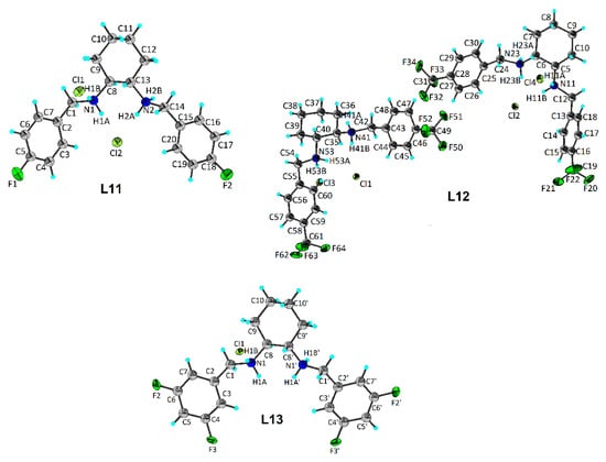 The Schiff bases L1–L4 were reacted with NaBH4 to yield reduced Schiff bases L11–L14. The compounds were isolated in the form of their salts with HCl and, for the compounds L11–L13, white or colorless crystals suitable for single-crystal X-ray analysis could be prepared by slow evaporation from the ethanolic solution. The compound L11 crystallized in the tetragonal I41/a space group (No. 88), the compounds L12 and L13 in the orthorhombic space groups–P212121 (No. 19) for L12, and Pbcn (No. 60) for L13. All compounds are hydrochlorides, i.e., the crystal structures contain chloride counterions compensating the positive charge on the amino groups. There are two chloride ions for each molecule, indicating that both amino groups are protonated. L12 crystallized as two independent molecules in an asymmetric unit, with eight molecules in the unit cell. Compounds L11 and L13 crystallized each as one independent molecule in an asymmetric unit, with 16 (L11) and 4 (L13) molecules in the unit cell. The molecular structures for compounds (L11–L13) are shown in Figure 4 and their crystallographic data are summarized in Table S5. The crystal structures of compounds L11–L13 are stabilized by a system of intermolecular hydrogen bonds and interactions (Table S2, Figures S5–S7 in Supplementary Materials).