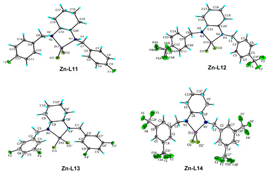 The X-ray crystal structures of Zn-L11–Zn-L14 displaying the atom-labelling scheme. Displacement ellipsoids are depicted at 50% probability level.