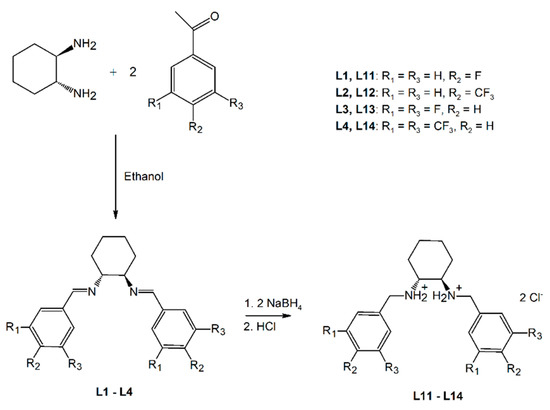 Synthesis of Schiff bases L1–L4 and their reduced forms L11–L14.