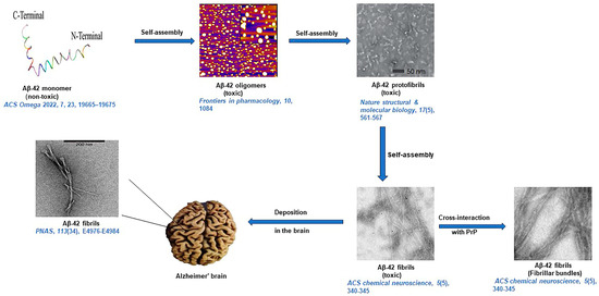 A diagrammatic representation of the amyloidogenic toxicity mechanism of Aβ42 fibrils’ formation and deposition in Alzheimer’s brain. A cross-interaction is shown between Aβ42 fibrils and prion protein (PrP) [50,54,55,56,57].