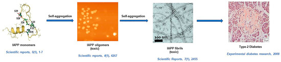 Westermark et al., for the first time, investigated the amyloid nature of IAPP aggregates using optical microscopy in T2D [134]. EM, AFM, and X-ray fiber diffraction techniques showed that the structures of IAPP aggregates resemble twisted protofilaments with distinct cross-β sheets. EM of IAPP amyloid fibrils present that the fibrils are long, unbranched, and exhibit a diameter of about 100 Å. An X-ray diffraction pattern depicts that the peak positions of the IAPP fibril occur at 4.7 Å meridional and 10 Å equatorial reflections corresponding to a cross-β pattern. CD and FTIR studies further implicate that the IAPP aggregates predominantly contain β-sheets. The Cryo-EM analysis of full-length IAPP fibrils in ice revealed a strong reflection at 4.7 Å which is similar to a strong meridional signal at 4.7 Å observed for Aβ (11–25) fibrils, supporting this cryo-EM feature as a common characteristic present in amyloid fibrils [135]. Cooper et al. monitored the growth, bi-directionality, and morphological change of individual amylin fibrils using time-lapse AFM. During the growth of a protofibril, it is elongated at both ends, indicating a bi-directionality of protofibril growth [136]. The structure of protofibril of amylin suggests that about 2.6 human amylin molecules are packed in 1nm protofibril [137]. Roeder and coworkers described the similarities of IAPP fibrils with amyloid-β fibrils with the help of Cryo-EM [138]. Their atomic model reveals two S-shaped fold-intertwined protofilaments of IAPP in the main polymorph that resemble the S-fold of Aβ fibrils in AD [134]. In the solid-state NMR (ssNMR) study, β-hairpin structures are observed in IAPP amyloid fibrils, and this β-hairpin structure consists of two β-strands [139]. Like other amyloids, after staining with CR, apple-green birefringence was observed under cross-polarized light, and enhancement in fluorescence intensity of ThT was noted after binding of IAPP aggregates [135]. A diagrammatic representation of amyloid formation in type II diabetes is illustrated in Figure 4 [140,141,142,143].