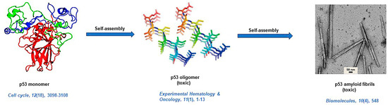 - Li, J.; Guo, M.; Chen, L.; Chen, Z.; Fu, Y.; Chen, Y. p53 amyloid aggregation in cancer: Function, mechanism, and therapy. Exp. Hematol. Oncol. 2022, 11, 66. [Google Scholar] [CrossRef]