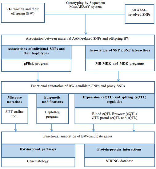 This work has been the first study to report a link between maternal AAM-associated genes SNPs with offspring BW. Four loci independently (rs7589318 POMC; rs757647 KDM3B; rs1079866 INHBA; rs999460 NKX2-1) and 20 SNPs in interlocus interplays have been BW-correlated. BW-associated AAM-linked 22 SNPs and 350 proxy loci were functionally related to 49 genes relevant with pathways such as the hormone biosynthesis/process and female/male gonad development. The study results outline is presented in Figure 5.