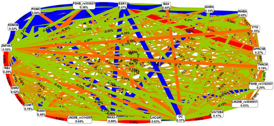 The entropy graph of gene × gene (SNP × SNP) interactions with birth weight. The figure outlines the gene × gene (SNP × SNP) interactions within the 2-, 3-, and 4-locus models obtained by the MB-MDR method. The percentage at the bottom of each gene (SNP) represents its entropy, and the percentage on each line represents the percentage of interaction between the 2 genes (SNPs). The red and orange lines indicate a stronger and weaker synergism, respectively, brown—an independent effect of individual gene (SNPs), green—weaker antagonism, blue—stronger antagonism.
