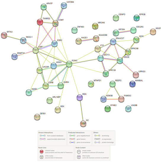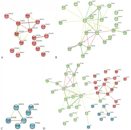 The network of BW-significant protein-protein interactions (P-Pi) obtained in the STRING program is shown in Figure 3 and indicates a significant level of these interactions (p < 10−16). The basis of these P-Pi has been the pathways listed above according to the Gene Ontology resource. In addition, interestingly, there were founded common RNA expression patterns for two pair BW-causal genes such as CDC25C and KIF20A (RNA coexpression score 0.796; these genes were functionally (sQTL/eQTL) related to rs757647 KDM3B), NKX2-1 and SFTA3 (RNA coexpression score 0.473; these genes were functionally (sQTL/epigenetic modifications) related to rs999460 NKX2-1). P-Pis have been clustered into three groups (Figure 4D). The first group (Figure 4A) consists of 15 proteins (ADCY3, CDC25C, CENPO, DNAJC27, EFR3B, FTO, GPRC5B, IQCK, KIAA0368, KIF20A, etc.) associated with BMI-related phenotypes (fat body mass, obesity, height). The second group (Figure 4B) was formed by 22 proteins (ARL14EP, ARVCF, BSX, COMT, DNMT3A, ESR1, ESR2, FSHB, GHRH, GPR139, HACE1, INHBA, KISS1, LHCGR, NKX2-1, POMC, REN, SFTA3, TXNRD2, UGT2B4, ZBTB1, ZNF483) involved in hormone-dependent processes (regulation of hormone secretion, estrogen receptor activity, ovulation cycle process, female/male gonad development, etc.). The third group (Figure 4C) was formed by seven proteins (FAM53C, GC, KDM3B, LIN28B, MTHFD1, REEP2, SYNE2), the joint functional role of which is not clear.