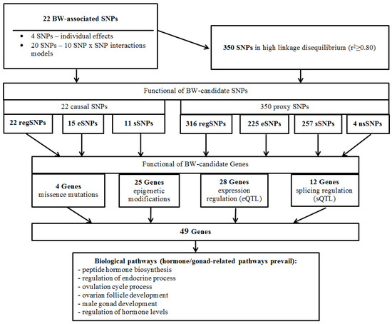 BW-involved pathways. A deep comprehensive analysis of the functionality of 22 BW-significant loci and 350 proxy SNPs, effectuated at previous stages of the study, showed the involvement of 49 genes in BW, including due to missense mutations (four genes such as ADCY3, GPRC5B, COMT, KISS1), epigenetic modifications (25 genes such as ADCY3, BSX, C11orf46, COMT, EFR3B, ESR1, ESR2, FSHB, FTO, GC, GHRH, GPR139, GPRC5B, INHBA, IQCK, KDM3B, KISS1, LHCGR, LIN28B, RBJ, NKX2-1, REN, TNNI3K, UGT2B4, ZNF483), eQTL (28 genes such as ADCY3, ARL14EP, ARVCF, CENPO, COMT, RBJ, DNAJC27-AS1, DNMT3A, EFR3B, ESR2, FSHB, GPRC5B, HACE1, KIF20A, KIAA0368, KNOP1, LIN28B, LINC00577, LRRIQ3, MANBAL, MROH8, MTHFD1, POMC, REEP2, REN, RP4-710M3.1, SYNE2, UGT2B4) and sQTL (12 such as ADCY3, ARL14EP, ARVCF, CDC25C, COMT, DNAJC27-AS1, FAM53C, KNOP1, LIN28B-AS1, SFTA3, TXNRD2, ZBTB1) regulation. A detailed analysis of the 49 BW-linked genes’ biological pathways, conducted using nine different databases integrated into the Gene Ontology resource (released 2023-03-06), revealed more than 10 different pathways (Supplementary Table S13), among which hormone/gonad-related pathways prevail: peptide hormone biosynthesis (R-HSA-209952; Fold Enrichment (FE) parameter > 100; p-FDR = 0.011), regulation of endocrine process (GO:0044060; FE = 44.76; p-FDR = 0.007), ovulation cycle process (GO:0022602; FE = 43.04; p-FDR = 0.003), ovarian follicle development (GO:0001541; FE = 33.78; p-FDR = 0.015), male gonad development (GO:0008584; FE = 18.52; p-FDR = 0.005) and regulation of hormone levels (GO:0010817; FE = 7.45; p-FDR = 0.006).