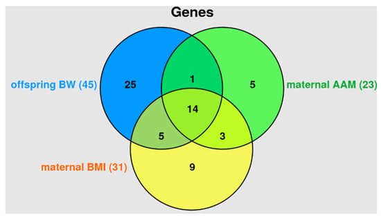 Among offspring BW-associated genes, 33.33% were maternal AAM-associated, 42.22% were maternal BMI-associated; while 31.11% (GHRH, ADCY3, EFR3B, ARVCF, COMT, HACE1, LHCGR, MROH8, LIN28B, LIN28B-AS1, MANBAL, POMC, RBJ, TXNRD2) were involved in the formation of all three phenotypes considered (offspring BW, maternal AAM and BMI) (Figure 6, genes functionally related to BW-,AAM-,BMI-associated loci (22 SNPs [the data of this work], 13 and 14 SNPs [24] respectively) and proxy SNPs) were considered). At the same time, 65.22% of maternal AAM-associated genes and 61.29% of maternal BMI-associated genes have been offspring BW-associated genes (Figure 4). Our data on the presence of common genetic factors offspring BW, maternal AAM and BMI correspond to modern literature materials [1,15]. Strong positive genetic correlations between BW and BMI/adult obesity [1] and causal genetic effect of BW on AAM (lower BW determined increased risk of earlier AAM) have been shown in several works [41,42]. The study by Tyrrell et al. convincingly showed that genetically raised maternal BMI was causally connected with increased offspring BW [15]. So, at the moment there is convincing genetic data on the association of higher pre-pubertal BMI (age 8 year) with earlier menarche [26,42], early menarche with high pubertal growth, pre-pubertal/adolescent/adult BMI [25,26,27,42], high maternal BMI with increased BW of the offspring [15]. At the same time, not high BW (as expected according to the above multi-stage correlation, such as high maternal BMI in childhood ─> early maternal menarche ─> high maternal BMI (adult) ─> high offspring BW will directly correlate with maternal AAM, but on the contrary, low BW is genetically associated with early menarche [41,42]. The above literature materials indicate the presence of common unidirectional genetic factors underlying the high maternal BMI and the high offspring BW and the ambiguous (including multidirectional) genetic correlations of maternal AAM and offspring BW.