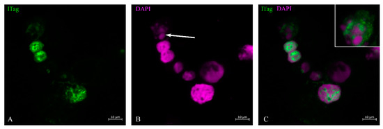 Firstly, we focused on the lTag as the early transcribed gene of the polyoma virus, incorporating a nuclear localization sequence similar to that of the SV40 virus [33], and therefore detected within the nucleus starting shortly after nuclear separation in the telophase. It spread in a ‘spider web’ fashion all over the nucleus in resting cells at specific stages of infection. We could show that it was redistributed into the cytosol when the nuclear membrane was dissolved, such as in the cell cycle, or destroyed, as in apoptosis. Whether lTag staining in apoptotic or mitotic cells detected the intact lTag protein or only a fragmented form or a specific splice variant [34] must be left open for this method.