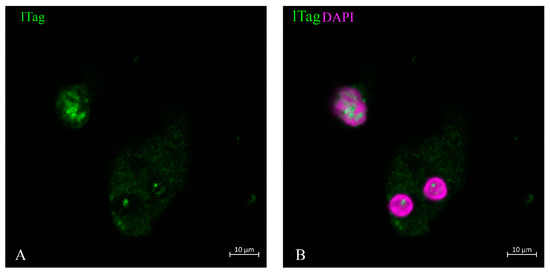 The double-stranded 5000 bp genome of the BKV or JCV encodes early transcribed genes, such as the lTag, and late-transcribed genes, of which VP1 is the major capsid protein that forms the outer layer of the viral capsid [24,25]. The lTag protein is translated in the nucleus shortly after infection of the cell and forms hexameric structures that bind to the viral genome ORI with their origin-binding domain [26,27], initiating replication of the BK- or JC viral genome. Transcription of the VP1 gene is initiated later, and virus particle formation may be initiated soon thereafter.