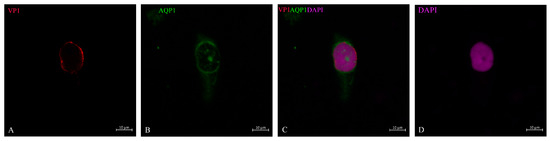 Encapsulation and production of the virus in the nucleus based on VP1 staining. Proximal tubule epithelial cell showed weak, homogeneous VP1 staining throughout the nuclear region, but with higher intensity at the nuclear margin (A); the cell was further defined by AQP1 staining (B). It is not clear whether the virus had passed through the nuclear pores or was concentrated in the outer region of the nucleus (C). This represented an early stage of infection, which was representative for 16–20% of VP1-positive cells in these patients. This is a representative picture, which was observed in such a status of virus replication from these patients. DAPI staining is shown in (D).