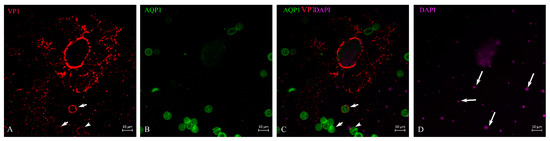 BK virus distribution within the cell and surroundings. Proximal tubular epithelial cell with AQP1 staining (B) over the nucleus. VP1 staining at the outer edge of the nucleus was retained, whose cytosol might have partly disintegrated and VP1-positive virus particles were distributed in a web-like fashion in exosome size inside of the cell and the area around it (A). This nucleus exhibited reduced DNA staining by DAPI (D). Erythrocytes known to be positive for AQP1 (B,C) were marked by VP1 (short-tailed arrows (A)) because of membrane binding of the BK virus. Apoptotic bodies floating around in the urine at the time of decoy cell collection (DAPI long-tailed arrows (D).