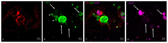 BK virus spreading in the surroundings of ghost cells. Partially disrupted proximal tubule epithelial cells and VP1-positive viral particles spreading around the cells in an exosome-like size (A). The ghost cells showed different intensities of AQP1 staining (green, long-tailed arrows (B,C)) and erythrocytes (short-tailed arrows (B)). DNA staining by DAPI (D) showed separated apoptotic bodies and the greatly reduced nuclear staining in the ghost cells (long-tailed arrows (B,D) and the fragmented nucleus in the upper part of the image (D).