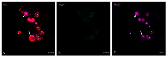 After lTag transcription and translation was deployed, further steps represent the production of virus capsid proteins. The outer layer of the capsid is the VP1, which is supplemented by VP2 and VP3 in the inner compartment of the virion. Its transcription and translation is achieved by host-cell enzymes in a strictly concerted mode. As already demonstrated, in the case of viruses, this can happen within the nucleus of the host cell [28], or the proteins are shuttled back into the nucleus from the cytosol due to the nuclear localization signal. We were able to show that in decoy cells of human BKPyVAN patients, the VP1 staining in cells with intact morphology could be restricted to the nucleus and its outer rim where it is concentrated (Figure 4A,C). As shown in the cell (Figure 4), the outer rim of the nucleus underwent some sort of demarcation and it was not entirely clear whether the virus particles had already passed the nuclear membrane. About 16–20% of VP1-positive cells were found at this stage of virus infection depending on the patient and specimen (Table 2). In contrast to these cells were decoy cells with a disintegrated nucleus and reduced DNA staining by DAPI, such as in Figure 5, or in an apoptotic nucleus (Figure 6 and Figure 7), where VP1 staining was distributed all over the cytoplasm (Figure 5) and seemed to represent a late stage of infection. In general, these cells were characterized by much stronger VP1 staining and represented the dominant version of the positive cells (80–84%, see Table 2). The staining intensity and thereby virus particle content showed remarkably different extent and differed from cell to cell. On rare occasions, these cells even appeared in clusters (Figure 7) and were positive for AQP1 as a marker of proximal tubular origin. In most of them, the cytoplasmic membrane appeared to be destroyed or had lesions.