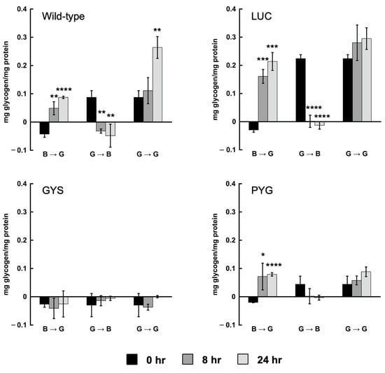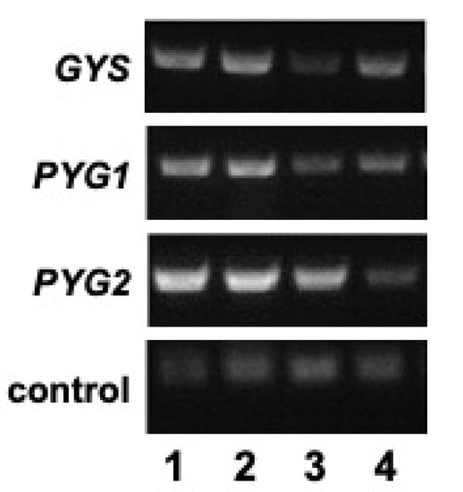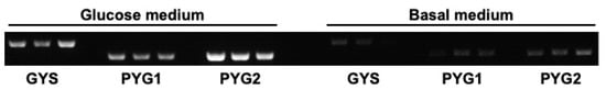 3.6. Expression of GYS, PYG1, and PYG2 Is Downregulated in the Absence of Glucose