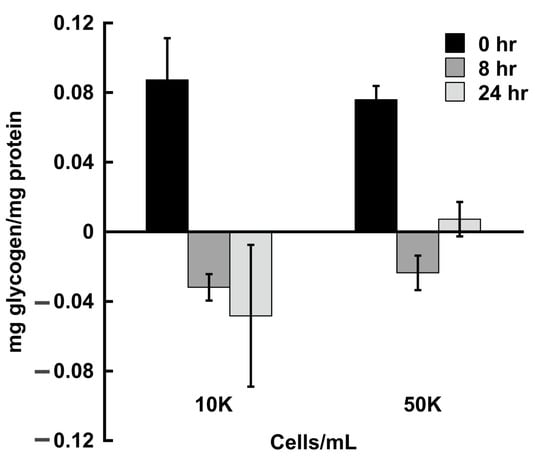 3.1. Cellular Glycogen Content Is Reduced during Growth in the Absence of Glucose