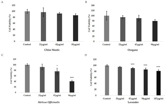 Evaluation of the cytotoxic effects of the essential oils from (A) Chios Mastic, (B) Oregano, (C) Melissa officinalis and (D) Lavender on HEK-293 cells. Cytotoxicity was assessed by applying MTT assay to HEK-293 cells subjected to essential oils treatment for 48 h. Viability of control vehicle-treated cells was considered 100%. Relative cell viability (Cell viability, %) is expressed as the viability of the cells treated with various concentrations of the respective essential oil compared to the viability of the control cells. Data were analyzed by t-test and are expressed as mean ± SD (n = 5), * p < 0.05, *** p < 0.001 compared to the respective control.