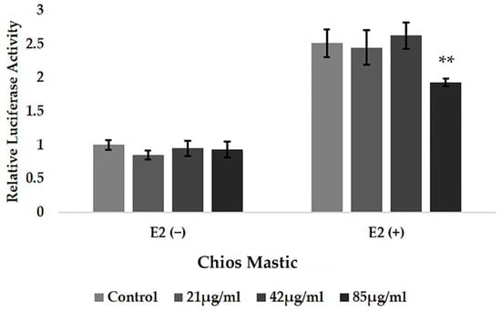 3.2. Chios Mastic Essential Oil Caused Moderate Reduction in the E2-Induced Transcriptional Activation of ERα