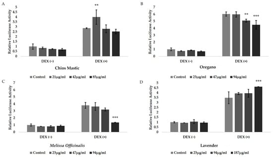 Regulation of the DEX-induced GR transcriptional activation by the essential oils from (A) Chios Mastic, (B) Oregano, (C) Melissa officinalis, and (D) Lavender in HEK-293 cells. Cells grown in hormone-free medium were transiently co-transfected with a GRE-Luc reporter gene construct and a β-galactosidase reporter construct. Subsequently, cells were treated with the indicated amounts of the essential oils, in the presence or absence of 1 μΜ DEX, for 6 h. Then, cells were harvested and lysed. Assessment of the luciferase and β-galactosidase activity in cell extracts was followed. Relative luciferase activity was expressed as normalized against β-galactosidase activity. Relative luciferase activity in control cells was set as 1. Data were analyzed by two-way ANOVA and are expressed as mean ± SD, (n = 6), ** p < 0.01; *** p < 0.001.