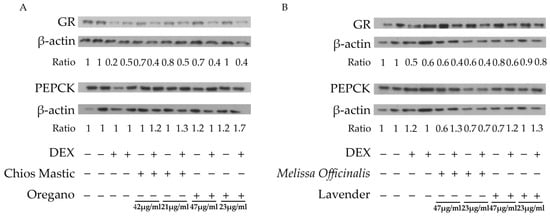 Regulation of GR and PEPCK protein levels by the essential oils from (A) Chios Mastic and Oregano, (B) Melissa officinalis and Lavender. Cells grown in hormone-free medium were incubated with the essential oils in the absence or presence of DEX 10−8 M, for 48 h in a hormone-free medium. Data were expressed as the ratios of bands intensity of GR and PEPCK normalized against the respective band’s intensity of β-actin. Relative band intensity of control cells was set as 1. The uncropped blots are shown in Figure S4.
